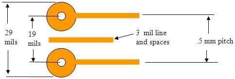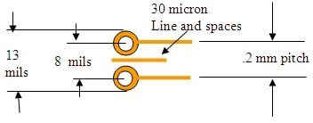使用新的微電路設(shè)計(jì)技術(shù)代替常規(guī)的印刷電路技術(shù)可節(jié)省大量的空間。如今,典型的75微米線寬的最佳間距約為.5mm,通過75微米線和250微米(10mils)的焊盤可得到75微米(3mils)。墊片之間的間距為225微米(9mils),墊片之間僅允許一條75微米的線,對(duì)于大多數(shù)商店來說,這種最小規(guī)格是很難的。
