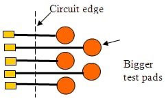 目前,飛行探針或什至是剛性探針(釘床)技術(shù)的下限為2-3mils。我們預(yù)計(jì)隨著時(shí)間的推移,它會(huì)降低,因?yàn)楸匾獣r(shí)需要更小的平臺(tái)。如果您的微電路具有較小的點(diǎn)(例如邊緣條連接器),則將電路以外的線路延伸到3-4 mil焊盤是明智的。
